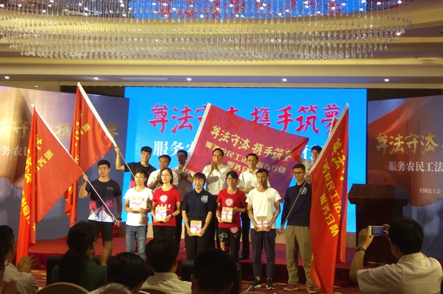 启动仪式上,全总和教育部领导共同为法治宣传行动服务分队代表授旗、发放农民工法治宣传教学大纲。来自北京大学、清华大学的高校师生代表作了发言。